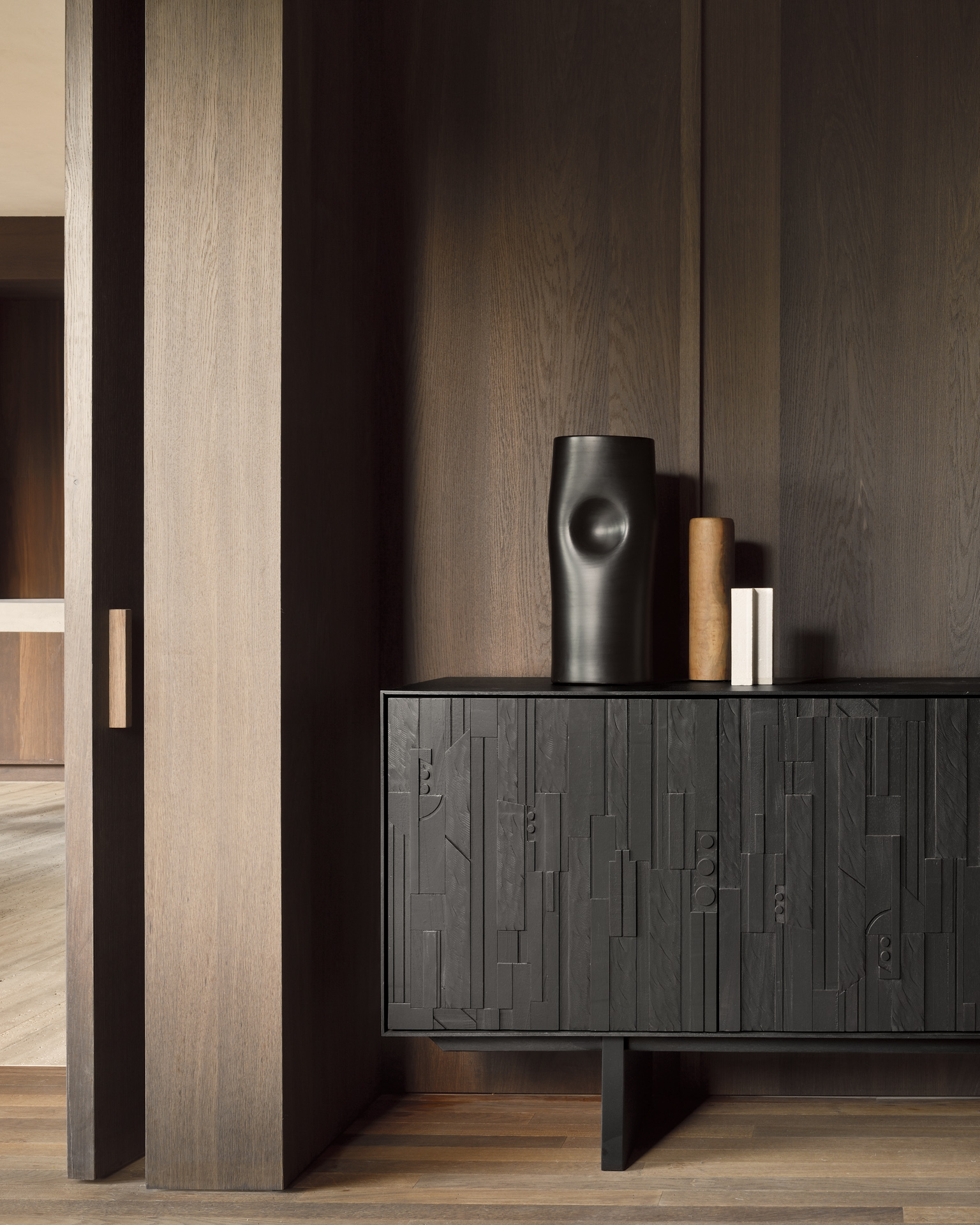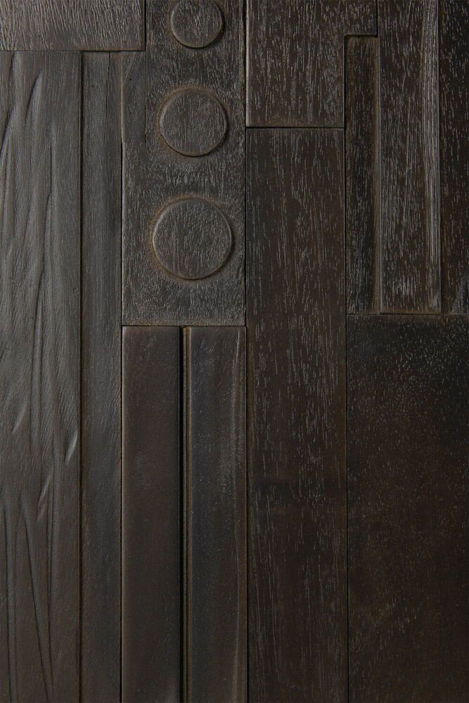 Buffet Mosaic 3 portes et une étagère – portes en acajou – structure et piétement en teck – vernis noir clair – 170 x 45 x H 82 cm – Ethnicraft